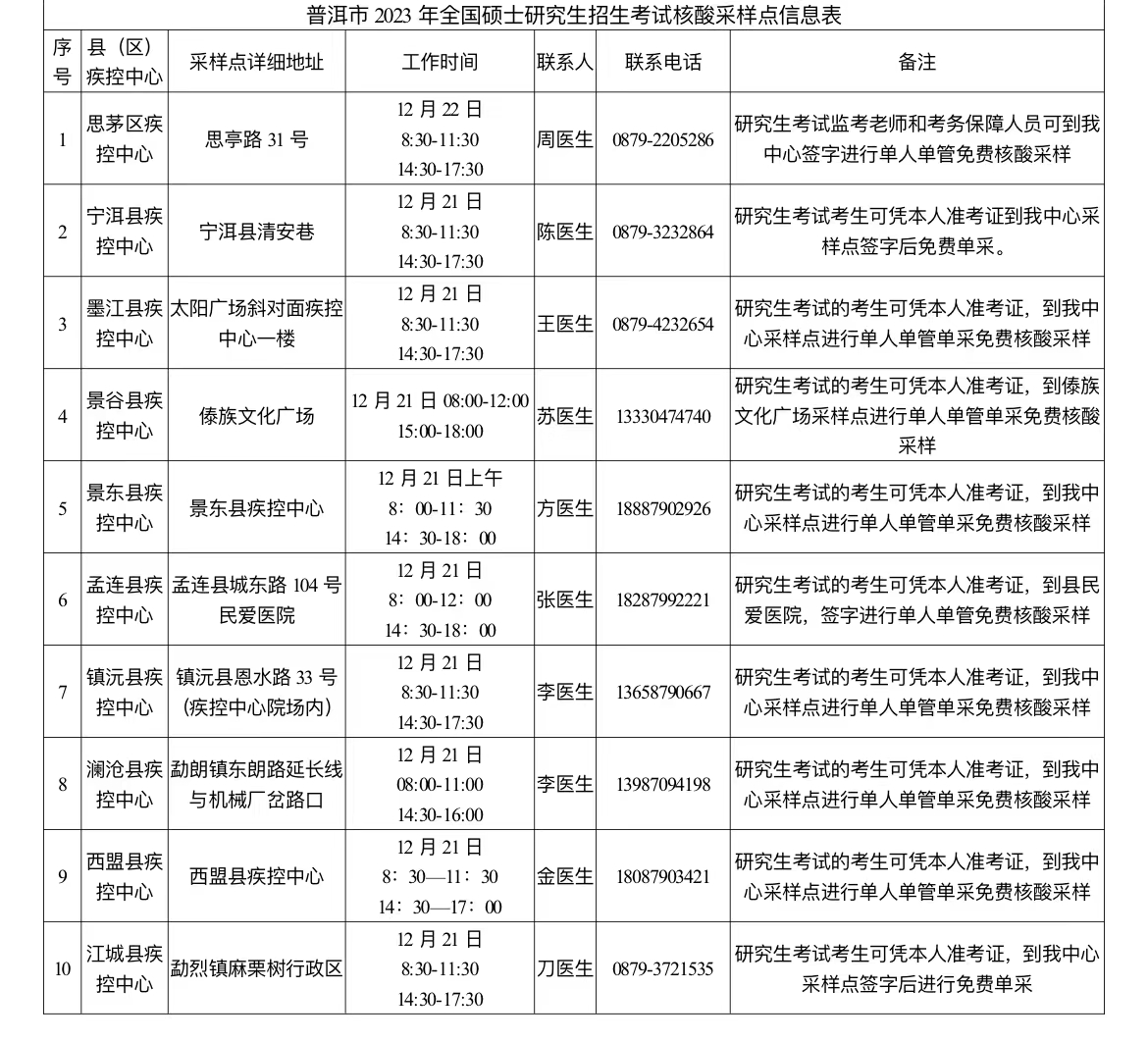 一、除在之前發(fā)布的《普洱市2023年全國碩士研究生招生考試考生告知書》中明確的核酸檢測點外,普洱市十縣區(qū)疾控中心也作為本次研考組考的定點檢測機構(gòu),于12月21日面向研考考生提供單人單管單采免費核酸采樣服務(wù)。十縣區(qū)核酸采樣點詳細信息及工作時間詳見附件(注:思茅區(qū)疾控中心僅為研究生考試監(jiān)考教師和考務(wù)保障人員提供核酸采樣服務(wù))。