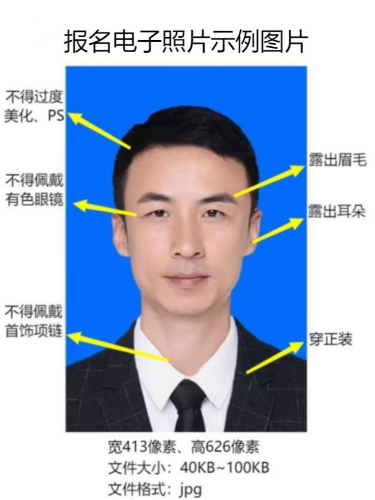(1)本人近三個月內(nèi)正面、免冠、彩色(藍、紅、白色底)證件電子照片,照片必須清晰完整,著正裝,電子照片文件類型為jpg格式。電子照片標準尺寸為413像素(寬)×626像素(高)。電子照片文件大小為40KB≤文件大小≤100KB,照片必須清晰完整。證件照片頭部、肩部所占比例約五分之四。