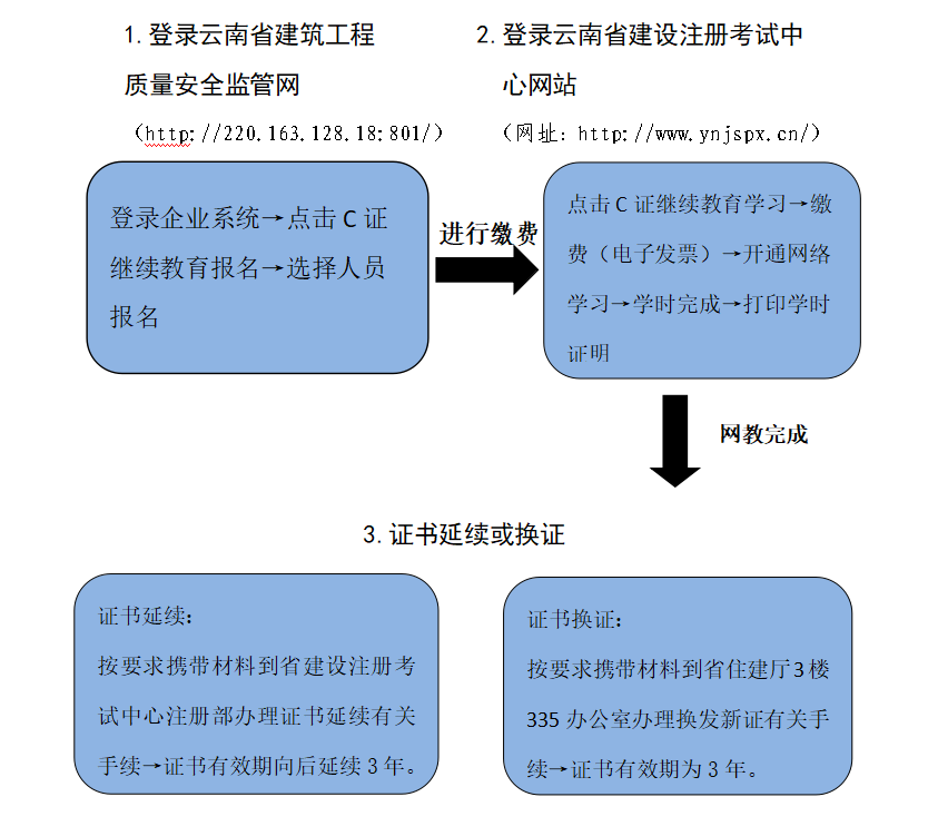 云南省建筑施工企業(yè)專職安全生產(chǎn)管理人員 (C證)繼續(xù)教育報名學(xué)習(xí)流程圖
