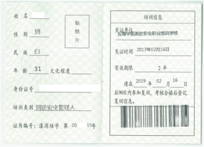 培訓后頒發(fā)云南省消防協(xié)會統(tǒng)一印制的《消防安全合格證》,證書全省通用。本證書面向社會單位開展消防安全教育、消防安全責任人、管理人培訓、滅火演練培訓等,并頒發(fā)消防安全培訓合格證。