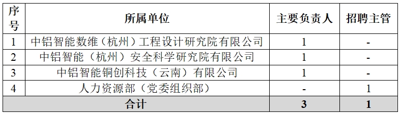 詳見《中鋁智能科技發(fā)展有限公司面向社會(huì)公開招聘崗位一覽表》(附件1)。