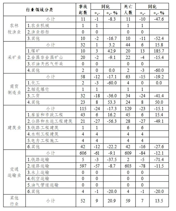 較大事故:煤礦事故3起、死亡12人,同比分別凈增加3起、12人;化工事故1起、死亡3人,同比凈增加1起、3人;工貿(mào)事故1起、同比持平,死亡3人、同比減少3人;房屋和市政工程事故1起、死亡3人,同比均持平;公路和水運工程建筑事故1起、同比持平,死亡8人、同比增加5人;鐵路工程建筑事故1起、死亡6人,同比分別凈增加1起、6人;道路運輸事故7起、死亡23人,同比分別減少5起、20人;其他行業(yè)事故2起、同比持平,死亡6人、同比減少2人。