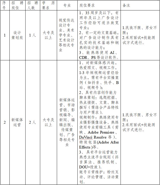 2.聘用方式:經(jīng)考察合格后,由澄江市啟澄人力資源有限責(zé)任公司與聘用人員簽訂勞動(dòng)合同,派遣至澄江市文化旅游投資開(kāi)發(fā)有限責(zé)任公司數(shù)字傳媒分公司工作。