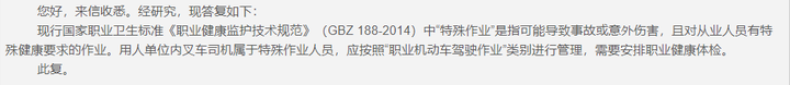 《職業(yè)健康監(jiān)護技術規(guī)范》(GBZ 188-2014)中“特殊作業(yè)”是指可能導致事故或意外傷害,且對從業(yè)人員有特殊健康要求的作業(yè)。用人單位內(nèi)叉車司機屬于特殊作業(yè)人員,應按照“職業(yè)機動車駕駛作業(yè)”類別進行管理,需要安排職業(yè)健康體檢。此外,氫元素教育的答復也比較專業(yè)和合理,見下文。