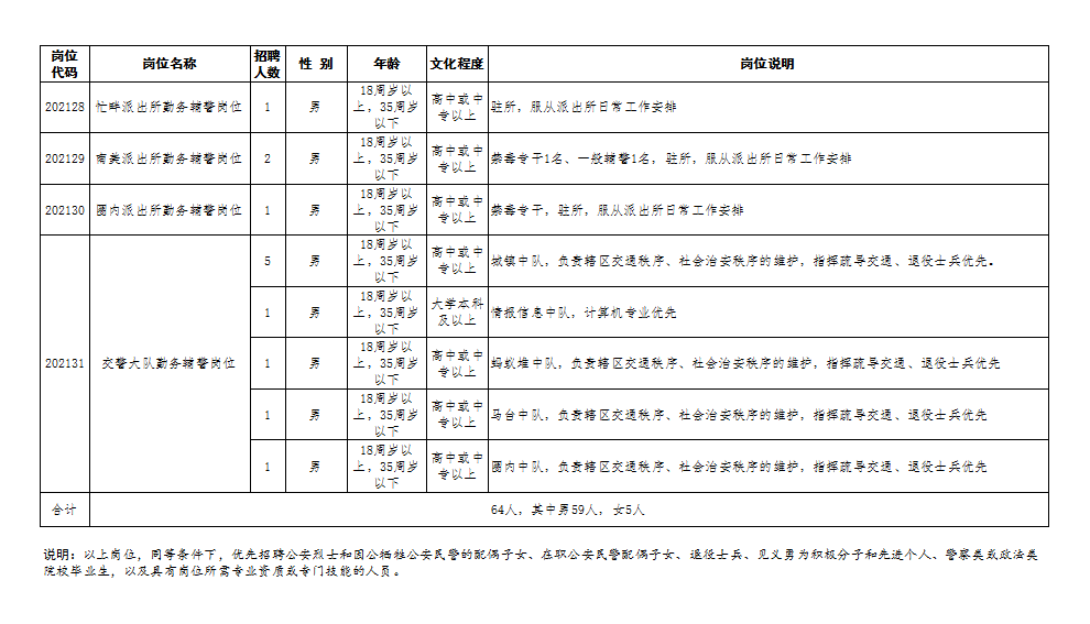 1、招聘名額:64名(男性59名,女性5名),具體崗位詳見(jiàn)招錄計(jì)劃表。